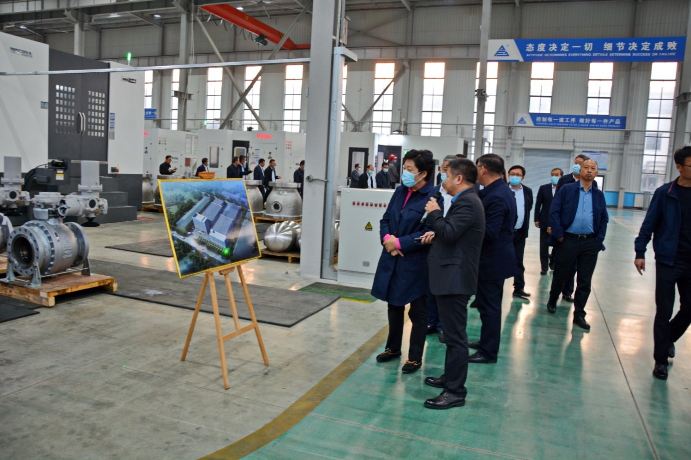 AFA公司董事长谢正泽向观摩团成员全面介绍了公司基本概况和发展规划,并陪同参观交流。观摩团成员深入AFA公司智能制造车间,参观了公司精加工、装配、检测、试压等主要生产线和关键工序,听取了公司高端阀门产业研发现状和近期发展目标以及公司当前疫情防控、生产经营、产品市场等工作汇报。佟海燕主任对AFA公司“科技含量高、市场前景好、自主国产化”的高端C型耐磨球阀产品给予了高度评价,对AFA公司管理团队精细管理、科技创新、自主研发给予了充分肯定,鼓励企业要立足现状,做大做强,再创新高,为地方经济社会发展作出更大贡献。